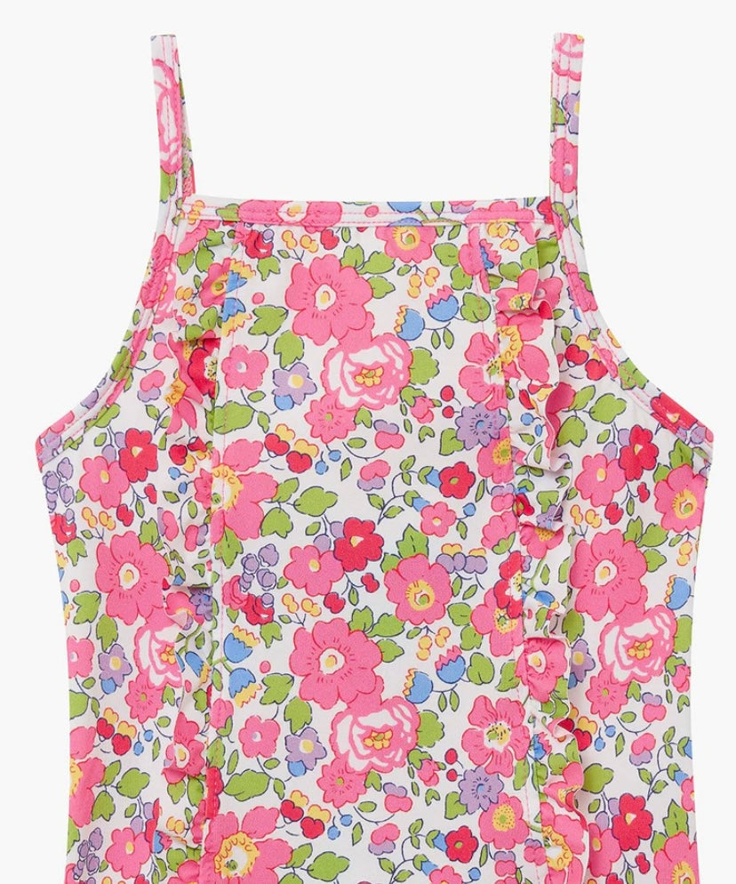 This swimsuit for baby girls is made in one of Liberty's most iconic prints; known for its stylised small floral design. Complete with pretty frills running down the body, it's perfect for splashing about on hot summer days.