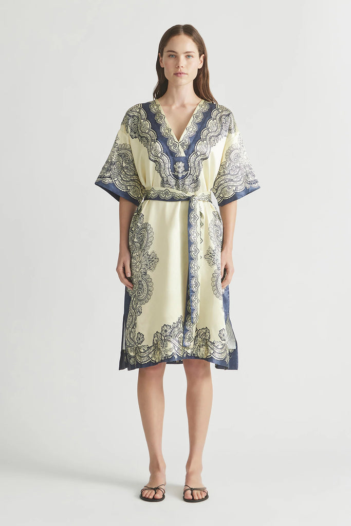 Embrace effortless elegance with the Islands Short Sleeve Kaftan by Antipodean. Featuring an intricate in-house print placed on luxurious silk hemp satin with a viscose lining, this kaftan offers a short-sleeved design with a flattering V-neckline. The side seam pockets add practicality, while the pleat at the back yoke enhances the draped silhouette. Perfect for a relaxed yet refined style, it’s a timeless addition to artfully curated wardrobes everywhere.