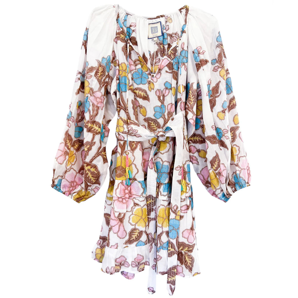 Silk cotton voile hand blocked mini dress with tassel tie neckline and balloon sleeves