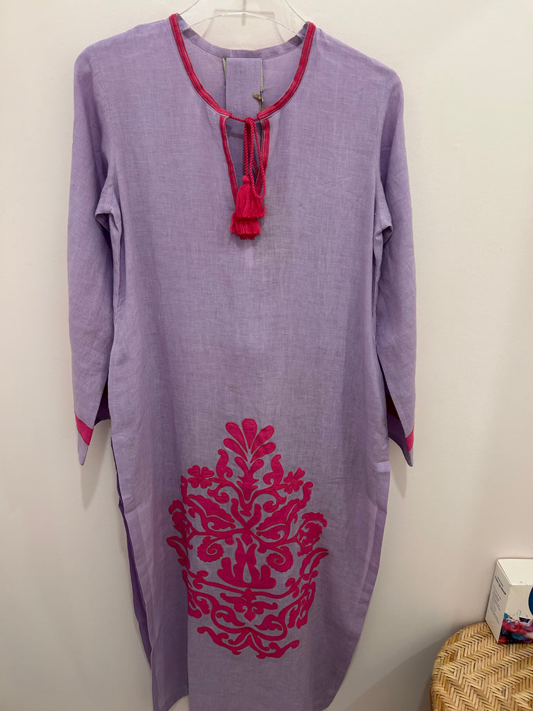 BENARAS~ Lavender w bright pink Tahiti appliqué kaftan 24876