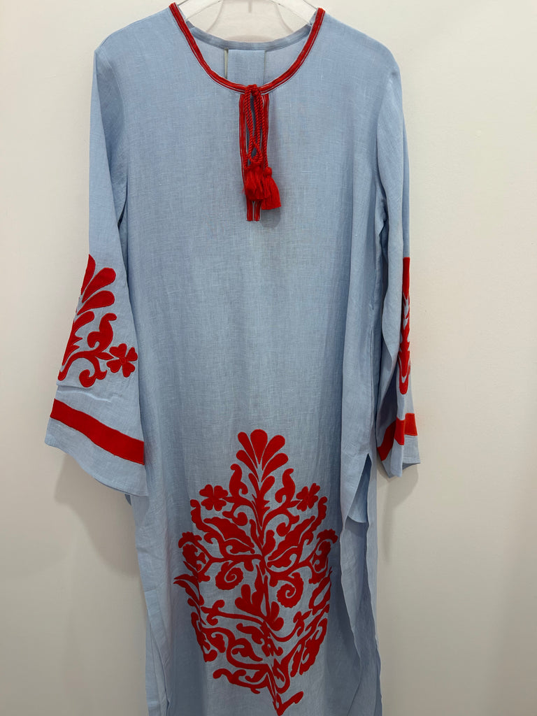 BENARAS~ Pale blue/red w Tahiti appliqué kaftan 24876