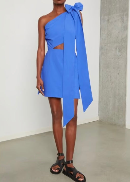 The oversize bow at the shoulder and the asymmetrical cutout are playful. And the Japanese cotton feels crisp and breathable. Factor in the vibrant cobalt hue and boom: You have an adorable (and attention-grabbing) dress for any warm weather occasion.