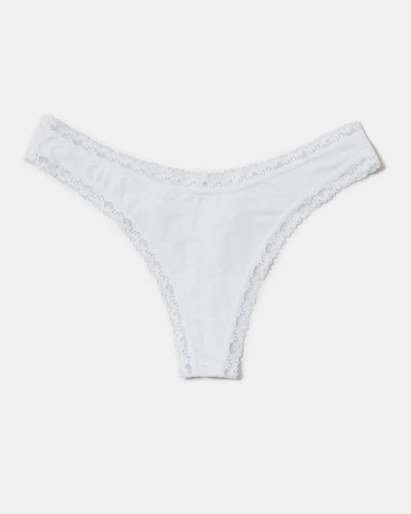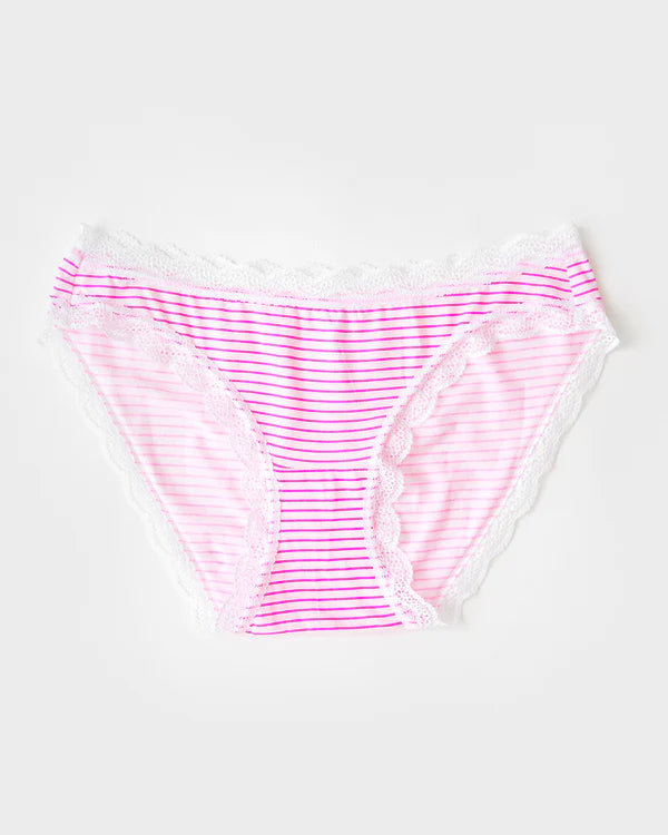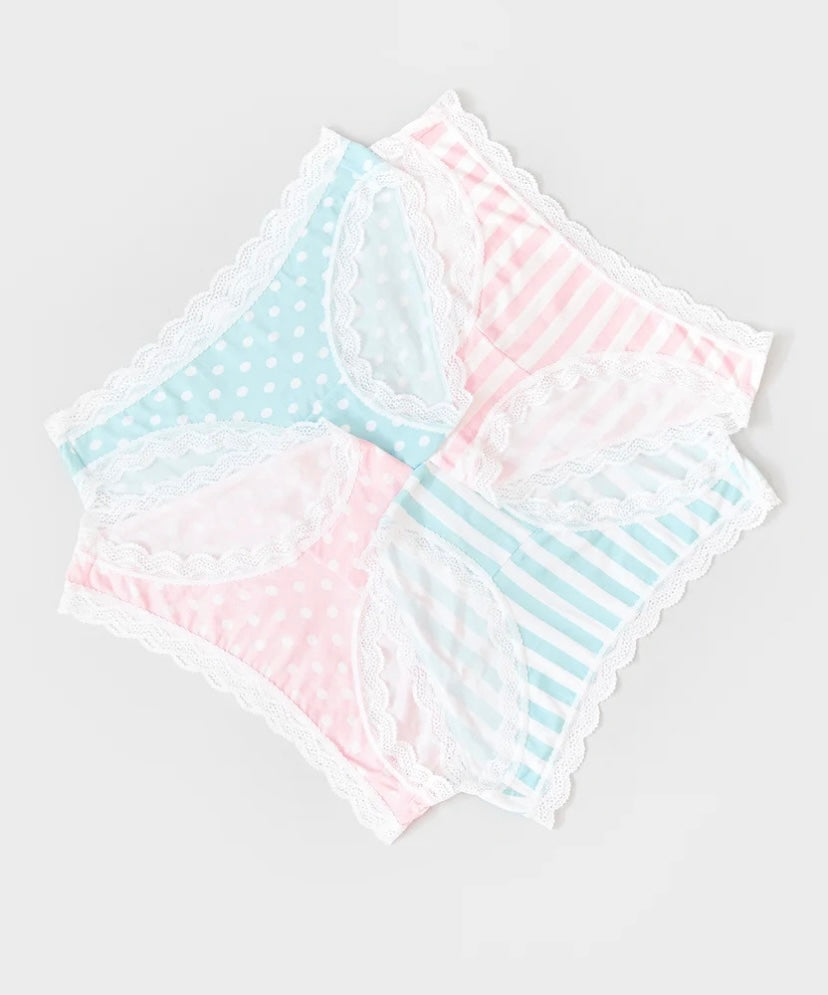 The Original Knicker Four Pack in Spots & Stripes print finished with lace trim, packaged with love in a gift box.